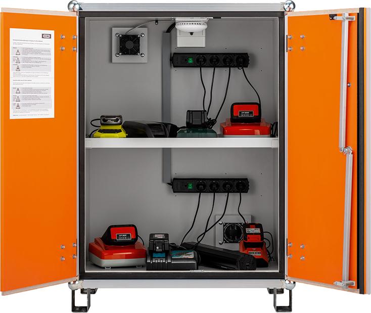 Dieser Akku-Ladeschrank verfügt über wichtige Sicherheitseinrichtungen zum Laden von Lithium-Akkus.