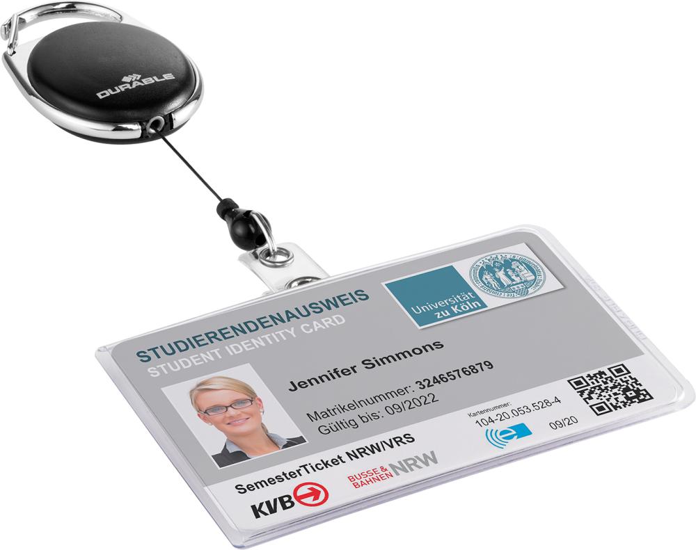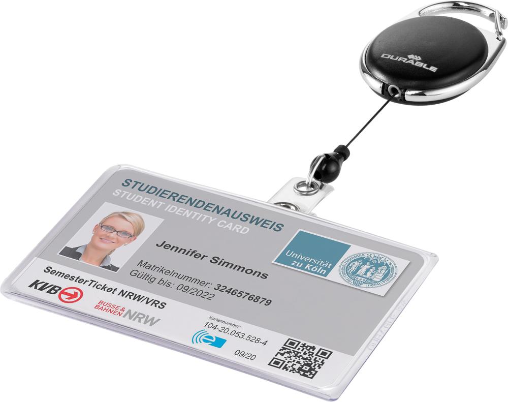 Diese Ausweishalter schützen Ausweis- und Zutrittskarten. • Ausführung: geschlossen, für 1 Betriebs-/Sicherheitsausweis im Querformat • Flexibles Material • Glasklar: für optimale Lesbarkeit und einfaches Scannen von Barcodes • Mit Daumenstanzung zum leichten Entnehmen der Karte • Jojo Style mit Karabiner und Druckknopf-Schlaufe • Bandlänge Jojo: 80 cm