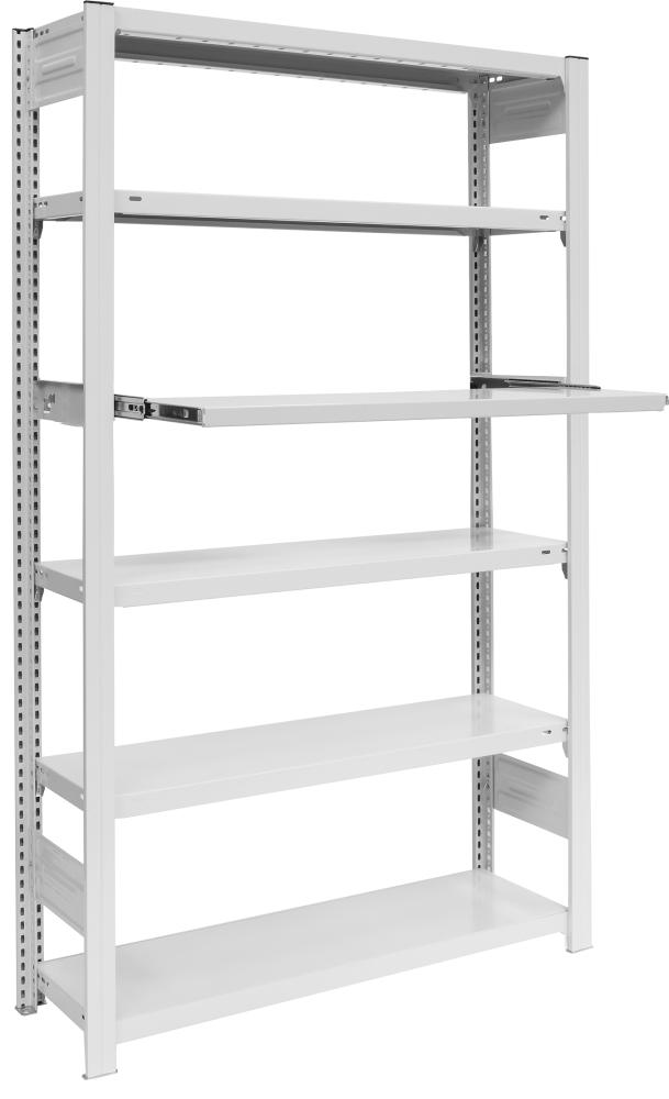 Dieser Auszugboden ist passend für alle Regalhöhen. • Höhenverstellbar: im Abstand von 25 mm • Boden: mit Teleskopschienen-Auszug • Fachlast: 60 kg Info: Bei mehreren Auszügen pro Regal sind Kippsicherungen erforderlich!