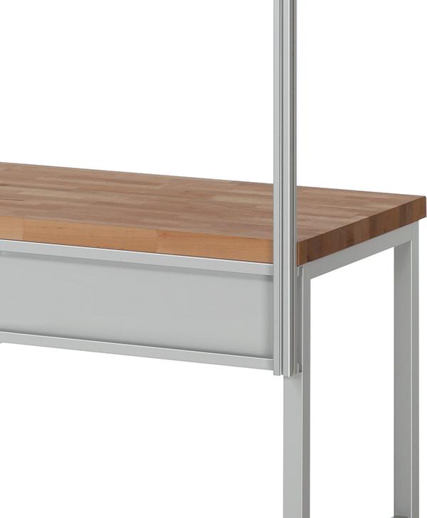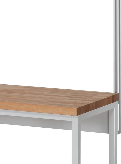 Der Querträger wird hinten unter der Tischplatte an das Gestell angebracht. Die Systemstützen (Aluminiumprofil 40x40 mm) werden an den Befestigungssatz angeschraubt (Höhe einstellbar) und laufen hinter der Tischplatte nach oben, sodass die gesamte Tiefe der Tischplatte frei bleibt (kein Verschrauben auf der Tischplatte). Die Systemstützen verfügen an allen 4 Seiten über eine Profilnut. Eine allseitige Nutzung ist damit möglich. Gewählt werden sollte der zur Breite des Arbeitsplatzes passende Befestigungssatz mit Systemstützen und danach die entsprechenden Anbauelemente.