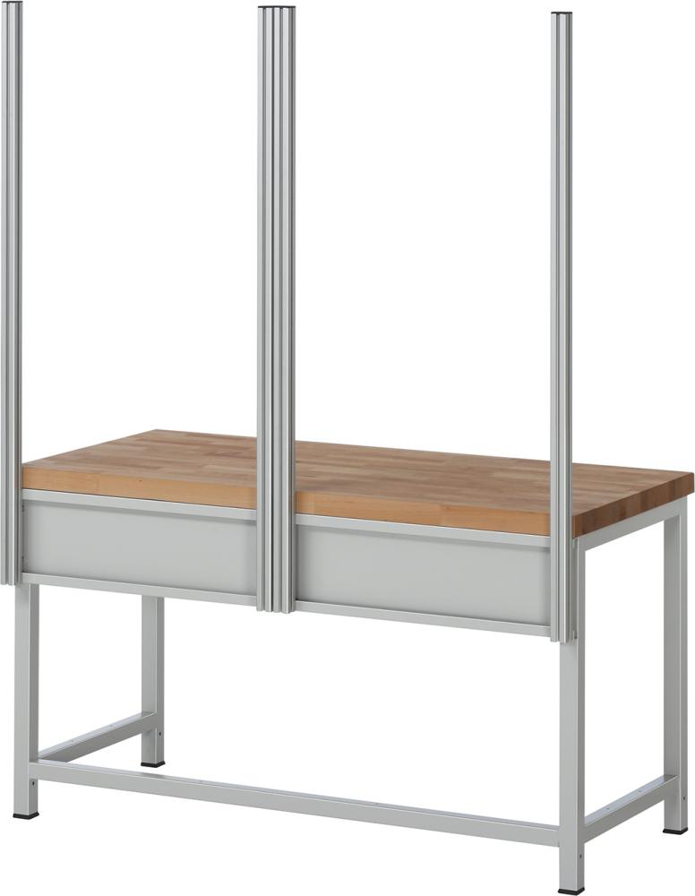 Der Querträger wird hinten unter der Tischplatte an das Gestell angebracht. Die Systemstützen (Aluminiumprofil 40x40 mm) werden an den Befestigungssatz angeschraubt (Höhe einstellbar) und laufen hinter der Tischplatte nach oben, sodass die gesamte Tiefe der Tischplatte frei bleibt (kein Verschrauben auf der Tischplatte). Die Systemstützen verfügen an allen 4 Seiten über eine Profilnut. Eine allseitige Nutzung ist damit möglich. Gewählt werden sollte der zur Breite des Arbeitsplatzes passende Befestigungssatz mit Systemstützen und danach die entsprechenden Anbauelemente.