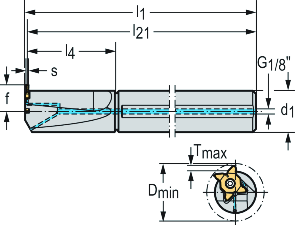 Bohrstange – Innenstechen G3221...-P • Schraubenklemmung • Präzisionskühlung • metrisch • Zylinderschaft mit Fläche • links • MX22 • s=1mm • Tmax=4mm