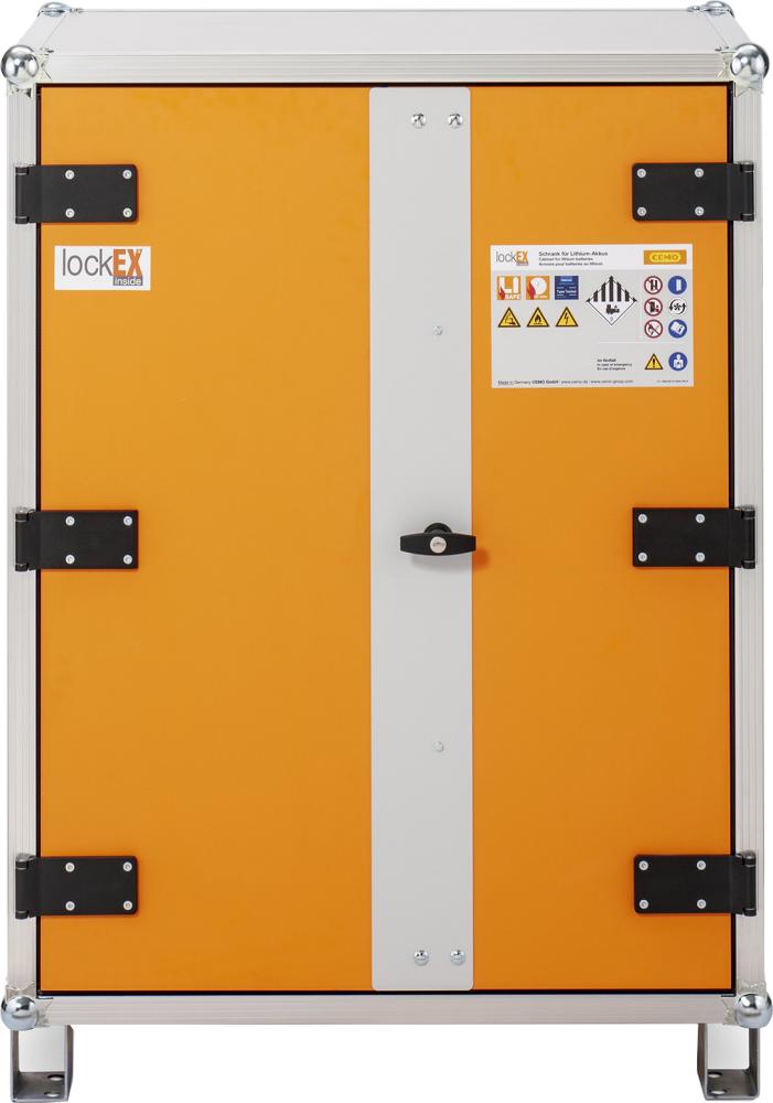 Sicherheit/Einsatz Schutz ohne Zeitlimit. Keine Kompromisse. Keine Zeitgrenze. Hält Batteriebränden vollständig stand. Kein Austritt von Flammen oder Funken. Ausführung • Laden und/oder Lagern mehrerer Lithium-Akkus im Schrank • Frühzeitige Alarmierung im Schadensfall • Alle relevanten Sicherheitsregeln zum Laden von Lithium-Batterien werden eingehalten • Ideal, um Akkus für den Ladevorgang von dem gelagerten Bestand abzuschirmen • Auch als Untertisch-Schrank unter der Werkbank einsetzbar • Geprüft nach VDMA-Standard • lockEX 2.0 ist nach dem neuesten VDMA Einheitsblatt geprüft, schützt effektiv über die marktüblichen 90 Minuten hinaus • Bauweise: mit nicht brennbaren, feuerwiderstandsfähigen Komponenten • Federbasierte lockEx-Türverriegelung: zur kontrollierten Druckentlastung bei Explosionen • Spezielle Brandschutzdichtungen: verhindern Flammenaustritt • Kaltrauchdichtes Verschlusssystem der Öffnungen • Transportierbar duch Stapelfüße • Türen: zweiflügelig, abschließbar, mit stabiler Verriegelung und Aufhängung • Lackierung: Tür in orange, ähnlich RAL 2004, Korpus in grau, ähnlich RAL 7035 Ausstattung Lagerschrank: Zwei batteriebetriebene, akustische Rauchmelder (ohne Stromanschluss, ohne Lüftung) Hinweis: CEMO lockEX ist eine federbasierte Mechanik in der Türverriegelung, die effektiv den Explosionsdruck sich entzündender Gase im Inneren des Schrankes bewältigt. Diese NO-BANG-Technologie gewährleistet den Erhalt der Schutzwirkung.