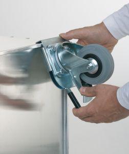Diese Rollen lassen sich werkzeuglos an alle ZARGES-Boxen ab Maße LxB 550x350 mm anbauen.