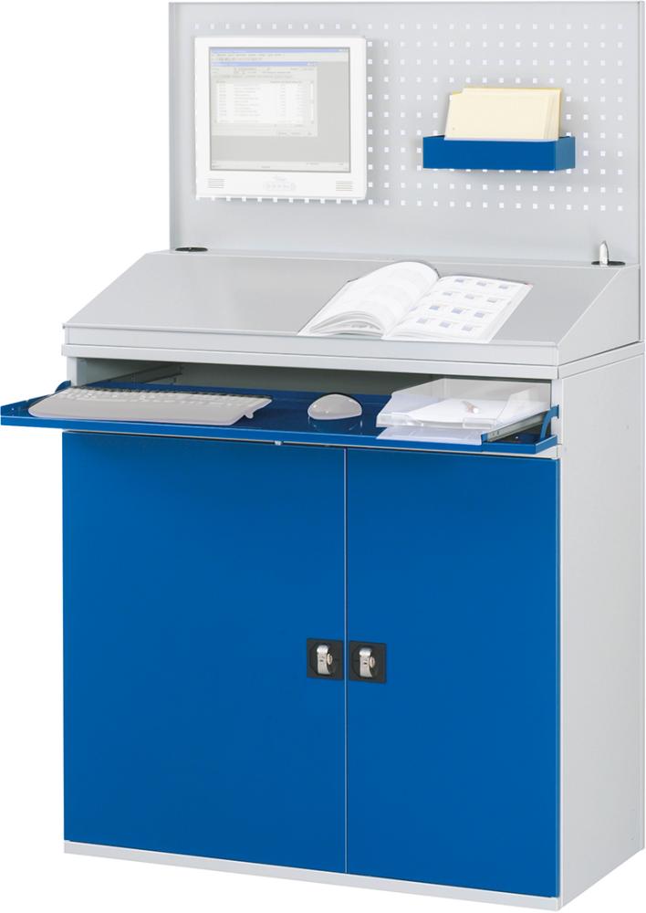 Diese Computer-Schränke verfügen über eine abschließbare Tastaturklappe mit Tastaturauszug.