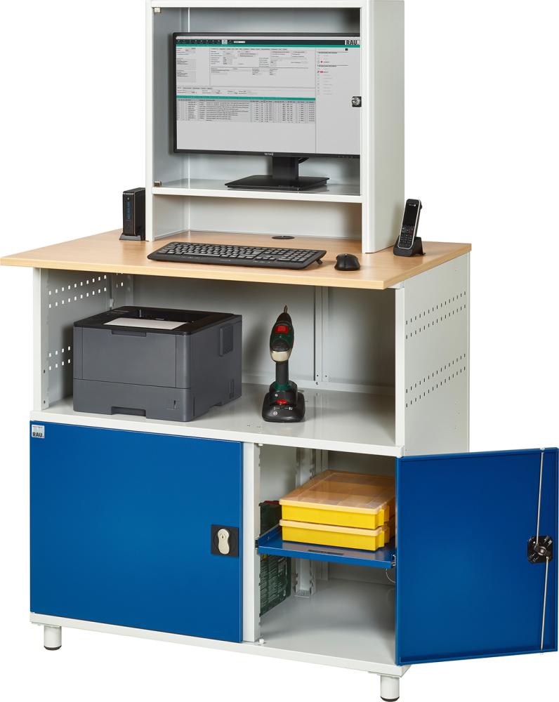 Computer-Tisch B1100xT800xH1810 mm RAL 7035/5010 stationär Gehäuse offen