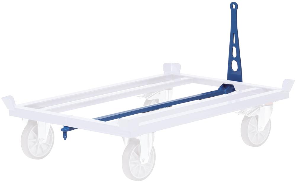Mit der Deichsel können bis zu 5 Fahrgestelle zu einem Zug verbunden werden. • Für den Transport mit Zugfahrzeugen bis 6 km/h • Maximales Zuggewicht 2000 kg • Deichsel aus Flachstahl profiliert, stellt sich mittels Gasdruckfeder selbsttätig in senkrechte Ruheposition • An der Bockrollenseite befindet sich ein stabiler Kupplungsbolzen • Verbindung durch Fußbetätigung möglich