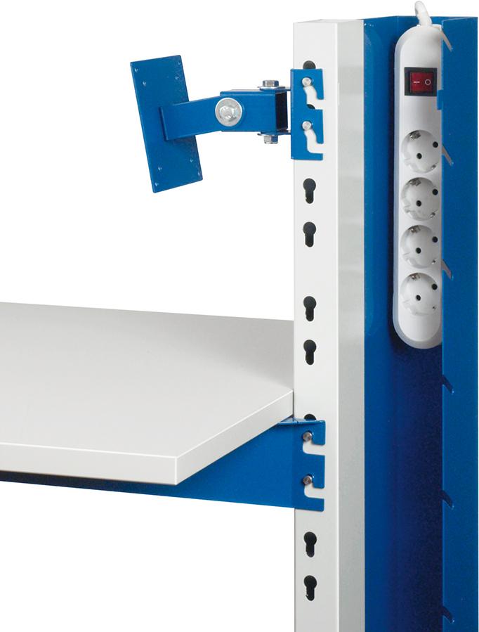 Dieser Computer-Ständer verfügt über eine Zentralsäule mit Systemlochraster. Dadurch lassen sich die Anbauelemente ganz leicht verstellen.
