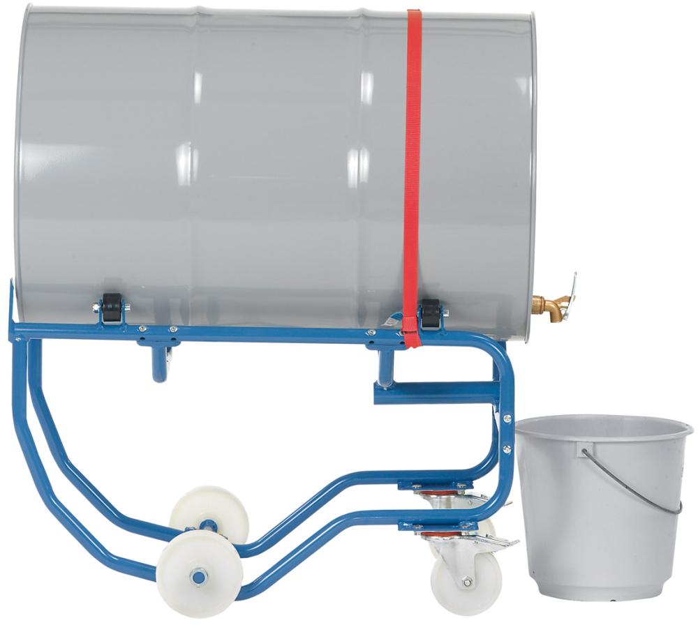 Der Fass-Kipper zum Lagern und Entleeren von 200-l-Stahlfässern verfügt über eine Hebelstange zum einfachen Kippen und einen Spanngurt zur Fass-Sicherung.