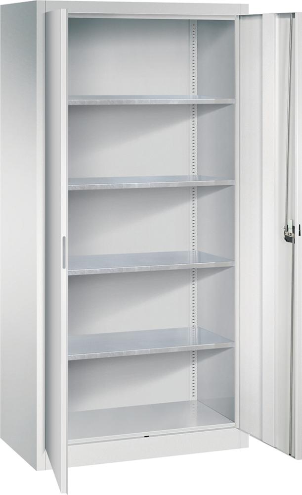 Der Flügeltürenschrank ist vielseitig einsetzbar. Die Fachböden sind verzinkt und belastbar bis ca. 110 kg.