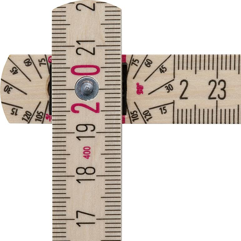 • Durch die eingelassenen Gelenke entsteht im ausgeklappten Zustand eine durchgehend gerade Kante, der Maßstab ist so auch als Lineal für eine durchgezogene Anreißlinie zu verwenden