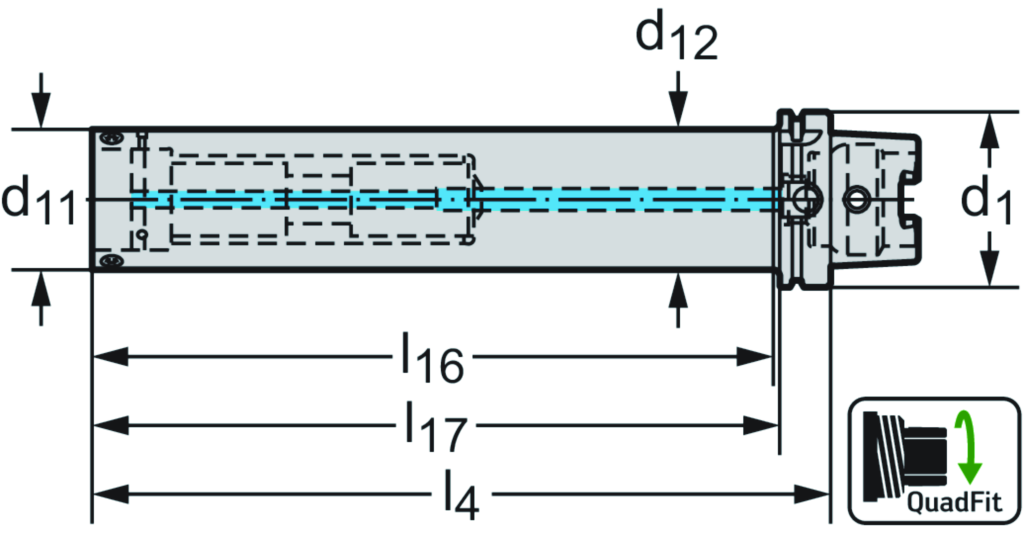 HSK-T Aufnahme – schwingungsgedämpft A3001-HSK-T • metrisch • Für A2201 Zwischenadapter mit QuadFit Schnittstelle • Mit voreingestellter Schwingungsdämpfung • d1=100 • d11=QL60