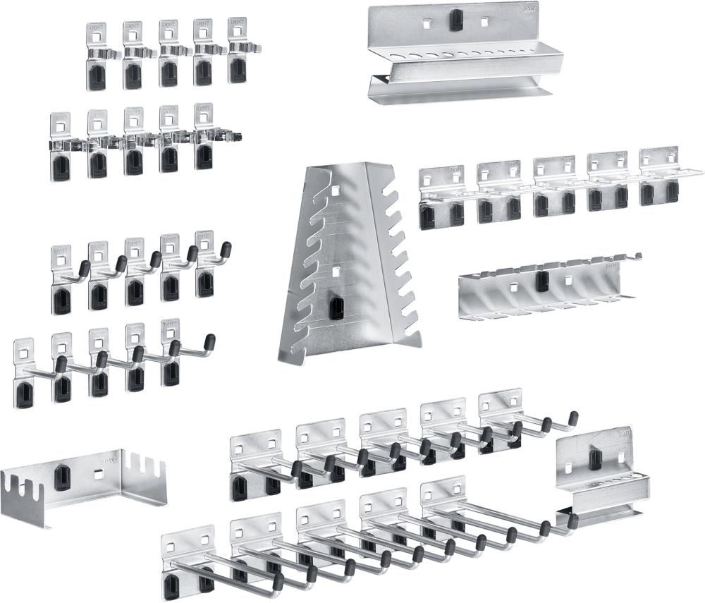 • Bestehend aus: je 5 Haken T 25/50 mm, je 5 Doppelhaken T 75/150 mm, 5 U-Halter, je 5 Wkz.-Klemmen Ø 13/25 mm, 1 Schraubenschlüsselhalter, 1 Sägenhalter, 1 Schraubendreherhalter, 1 Sechskantschlüsselhalter, 1 Bohrerhalter