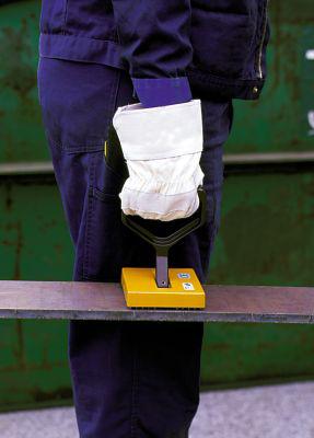 Die magnetische Handtrageklaue wird beim waagerechten und senkrechten Stahlblechtransport eingesetzt. Außerdem kommt sie beim Abheben von Blechen vom Stapel, Herausziehen von Blechtafeln aus Regalen oder Transport von flächigen Teilen aus magnetisierbarem Stahl zum Einsatz. • Blechdicke: je nach Einsatzbereich zwischen 1 und 5 mm Hinweis: Anschlagfläche der Klaue muss frei von Schmutz, Öl, Fett, Zunder, Rost, Farbe etc. sein.