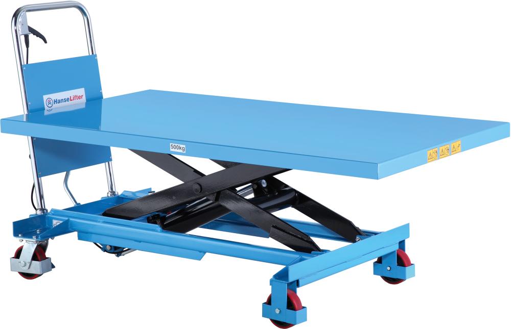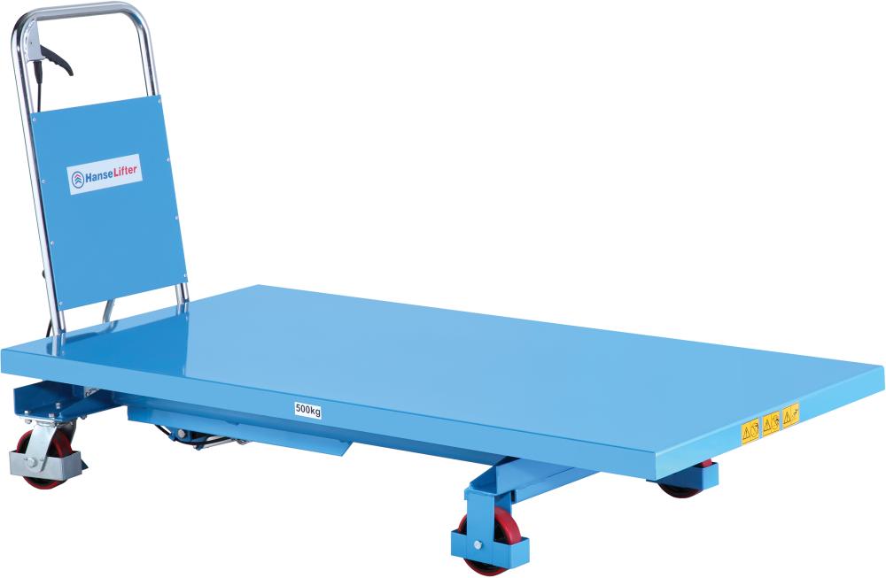 Der manuelle Hubtischwagen verfügt über eine extra große Tischplatte. • Tragfähigkeit: bis 500 kg • Hubhöhe: bis 900 mm • Fußpumpe: zum Heben des Tisches • Absenkung: per Hebel am Griff • Qualitäts-Hydraulikzylinder • Räder: Polyurethan-Rollen für besonders ruhigen Lauf und Feststellbremse an beiden Lenkrädern • Hochwertige Pulverbeschichtung: RAL 5012 blau