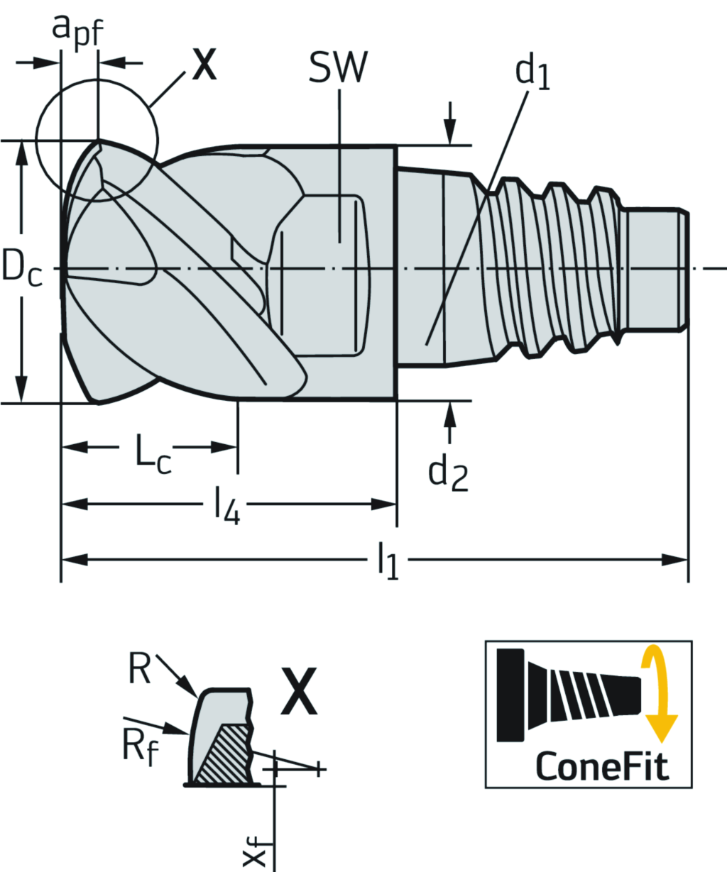 Keramik-Eck-/Nutfräser MC075 • ConeFit • metrisch • Drallwinkel 35° • WIS10 • Dc=25mm • Z=4