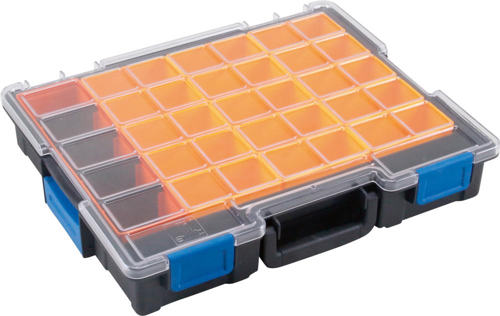 Der Kleinteilekoffer ist erweiterbar mit den herausnehmbaren Einsatzboxen und/oder Trennstegen. • Mit Clips • Deckel : transparent, fest schließend (keine Durchmischung des Inhalts) • Griff: ergonomisch und klappbar • Verbindungsverschluss: ermöglicht den Transport von bis zu 3 Kleinteilekoffern
