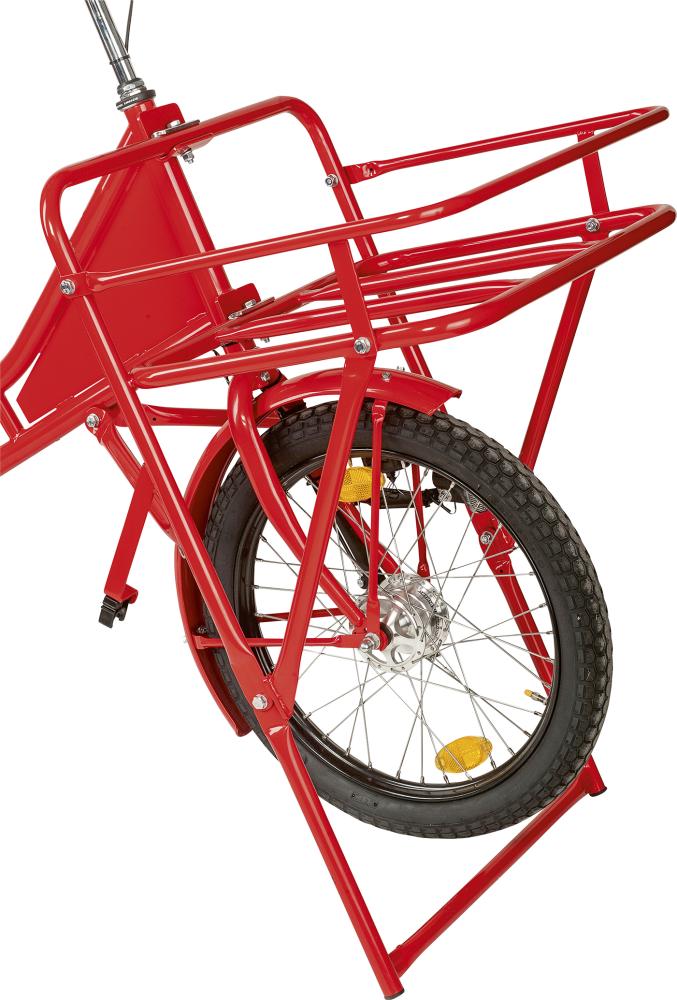 Diese robusten und soliden Lastenfahrräder (Bäckerfahrrad im Retro-Look) haben auf dem großen Vorderrad-Lastenträger 50 kg Tragkraft. Der integrierte Vorderrad-Ständer ist besonders standsicher.