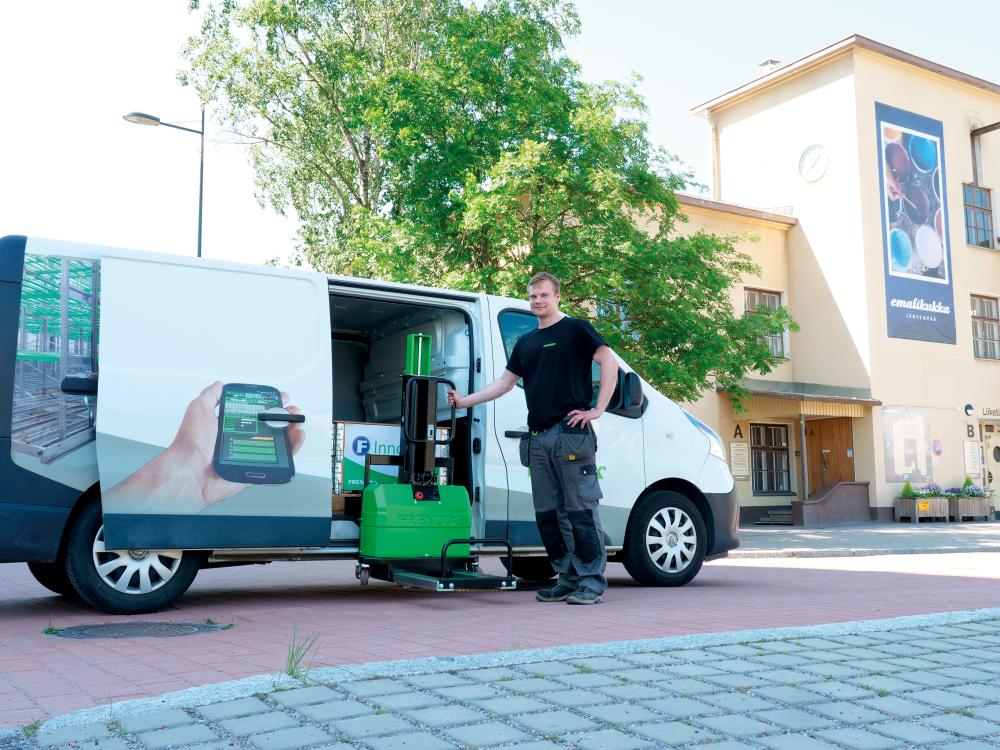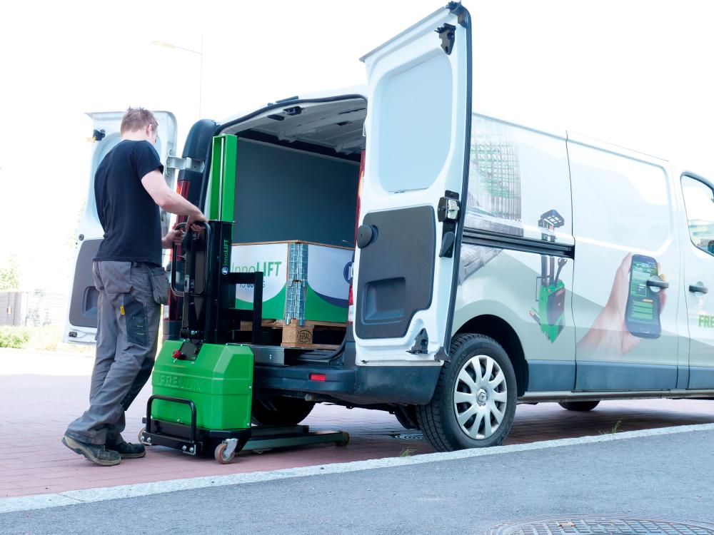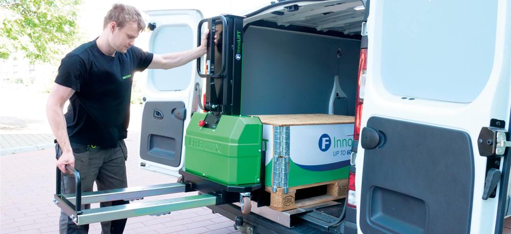 • Mobile Verladelösung von Paletten • Im Anschluss kann das Gerät sich selbst in das Fahrzeug, ob Lkw, Pritschenwagen oder Sprinter, je nach Ausführung heben • Mittels der optional angebotenen Ladeplatte kann ein hinderlicher Zwischenraum oder auch eine Anhängerkupplung übewunden werden • Passt in jedes Fahrzeug: vom kleinsten Transporter bis zum größten Lkw • Geringes Eigengewicht und große Hubkraft • Fahrzeugungebunden einsetzbar • Hubantrieb elektrisch, ohne Fahrantrieb • Batterie: 12V 50AH, Batterietyp AGM Schritte Entladen 1. Palette mit InnoLIFT anheben. 2. InnoLIFT aus dem Fahrzeug ziehen. InnoLIFT stoppt von alleine in der richtigen Position. 3. Palette absetzen und Schlitten nach hinten ziehen. 4. InnoLIFT soweit absenken, dass der Schlitten wieder unter das Fahrzeug geschoben werden kann. InnoLIFT mit eingeschobenem Schlitten bis auf die Fahrbahn absenken und die Palette aus dem Fahrzeug ziehen. Schritte Beladen 1. Palette mit dem InnoLIFT anheben und in das Fahrzeug schieben. 2. Palette absetzen, den Schlitten nach hinten ziehen und den InnoLIFT hochfahren. 3. Schlitten zurück unter die Palette schieben und die Palette leicht anheben. 4. Palette mit dem InnoLIFT ins Fahrzeug schieben und absetzen. Hinweis: Der InnoLIFT stoppt automatisch in der richtigen Position, wenn er aus dem Fahrzeug gezogen wird, so dass er nicht herausfallen kann.