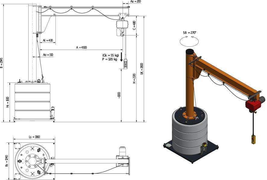 Mobiler Säulenschwenkkran320kg,4,5m,270 MOBILUS+Elektrokettenzug MOB12-AS3,2-4,5