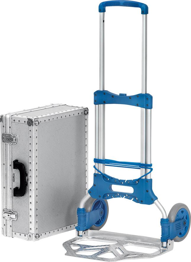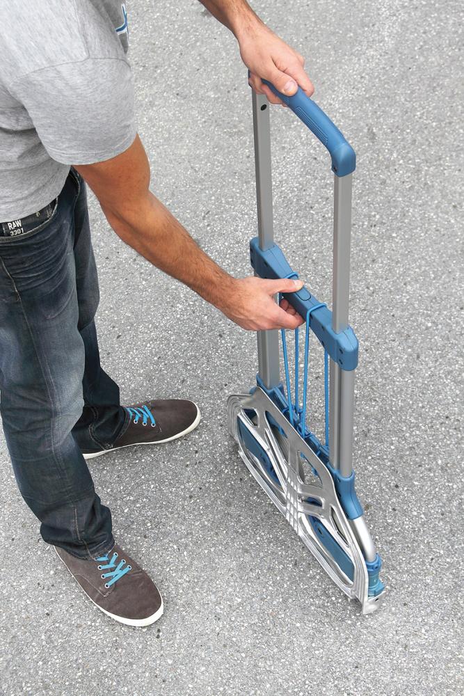 Der handliche, zusammenschiebbare Aluminium-Paketroller ist mit rutschsicheren Griffbügeln ausgestattet.