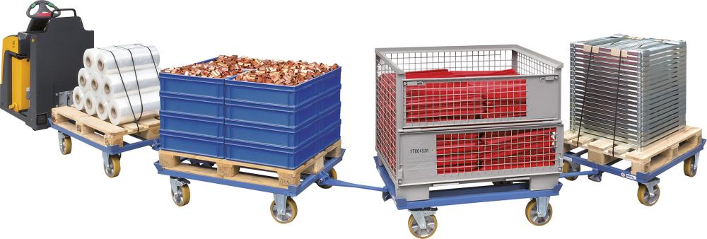 Für eine bestmögliche Spurtreue hat das Paletten-Fahrgestell einen stabilen Kupplungsbolzen mit Führungsmaul und selbsttätiger Sicherheitsverriegelung an der Lenkrollenseite. • Robuste Winkelstahl-Schweißkonstruktion: mit Fangecken • Mit routenzuggeeigneten Stahlgestellen • Pulverbeschichtung: RAL 5007 blau • Räder: 2 Lenk- und 2 Bockrollen • Bereifung: Polyurethan auf Alufelgen, nicht kreidend (spurlos), geräuscharmer Lauf auf ebenen Böden • Naben: mit Kugellagern • Deichsel: selbstsichernd, aus Flachstahl an der Bockrollenseite, mit dem Fuß zu bedienen, stellt sich selbsttätig senkrecht in die Ruhestellung • Maximale Anzahl Fahrgestelle: 5 in einem Zug • Maximale Zuggeschwindigkeit: 6 km/h • Maximales Zuggewicht: 3000 kg