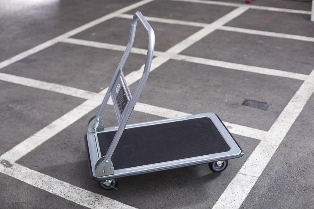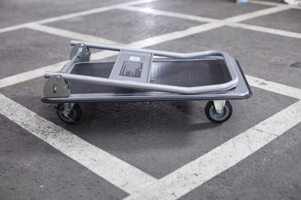 Dieser klappbare Schiebebügelwagen verfügt über eine verstärkte Ladefläche und einen umlaufenden Stoßschutz.
