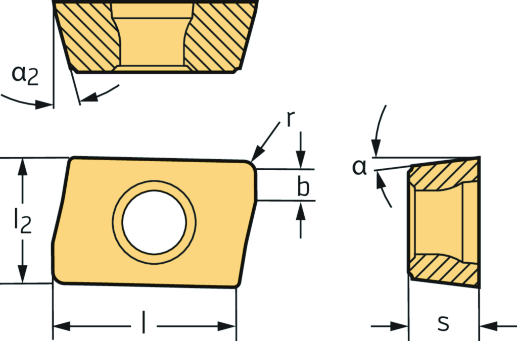 Rhombisch positiv ACGT ...-G65 • Hauptfreiwinkel=7° • WKP35G • Tiger·tec® Gold • Eckenradius=0,4mm • Planschneidenbreite=0,9mm