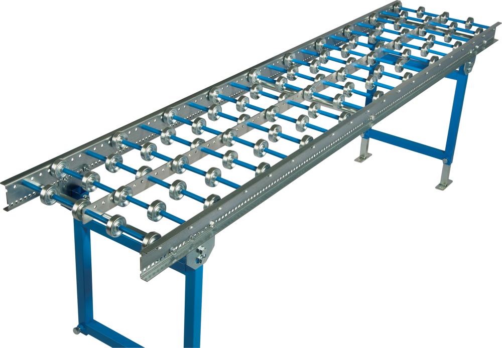 Die Leicht-Röllchenbahnen sind für Güter bis 30 kg/Stück (Richtwert) ausgelegt (Bahnbreite und Achsabstand müssen berücksichtigt werden). • Rahmen: U-Profil 20/70/20 x 2, Stahl, verzinkt • Röllchen: Ø 48 mm, Stahl, verzinkt, kugelgelagert • Achsen: Ø 8 mm, verschraubt • Stützen und Zubehör: optional lieferbar Info zur Nutzung: Das Fördergut muss mindestens eine Breite von 200 mm haben, und einen flächigen und stabilen Unterboden aufweisen.