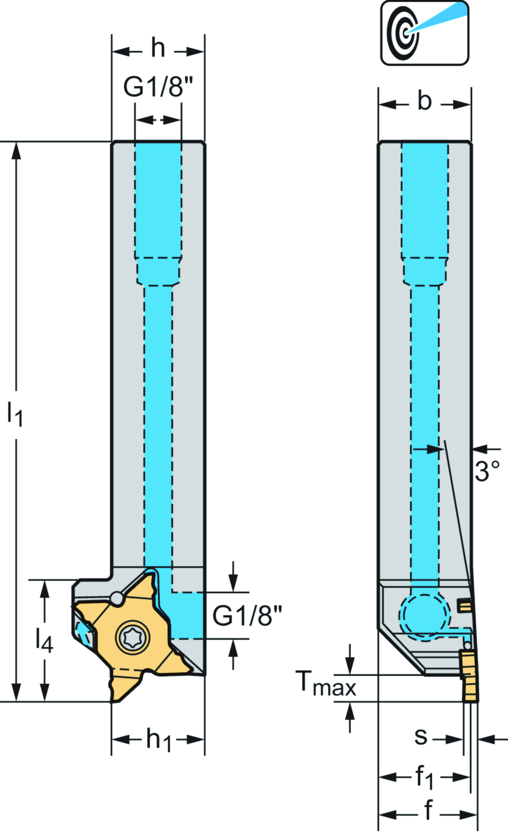 Schaftwerkzeug 3° – Radialstechen G3051...-P • Ein- und Abstechen an hohen Schultern • Präzisionskühlung • inch • Vierkantschaft • rechts • MX22 • s=1mm • Tmax=6mm