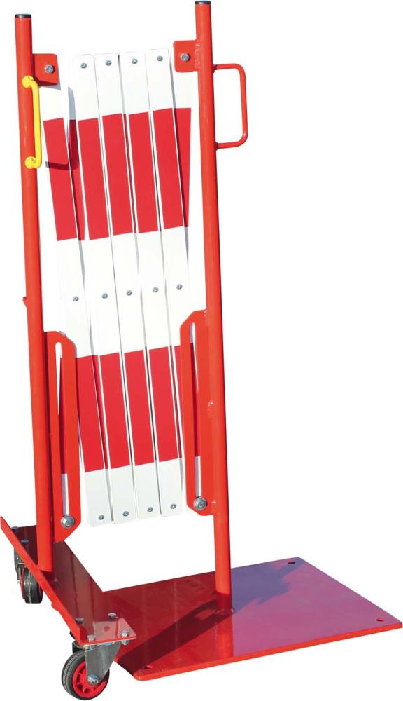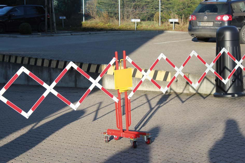 Mit 2 Rollenfüße, 500 mm Breite und Feststeller, mittig platziertem Überwurf zur Verbindung der aufeinander zulaufenden Scherengitter und zur Befestigung eines Infoblattes DINA4.Eigenschaften