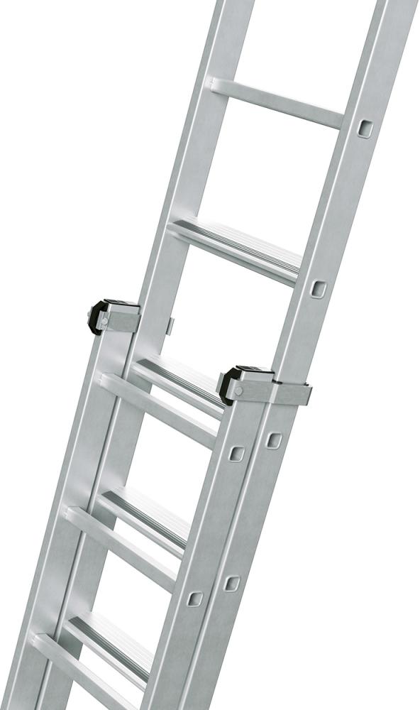 Diese Schiebeleiter verfügt über auswechselbare Kunststoffschuhe für einen sicheren Stand. • Material: Aluminium • Sprossen-Holm-Verbindung: gebördelt • Unterleiter mit Sprossen: geriffelt, 30 mm tief • Oberleiter mit Stufen: 80 mm tief und mit Gummi-Laufrollen • Höhenverstellung: im Raster von 280 mm • Kunststoffschuhe: für rutschsicheren Stand, auswechselbar • Leiterbreite: 420 mm • Belastung: max. 150 kg • Geprüfte Sicherheit: entspricht der Norm EN 131 professional und erfüllt die Anforderungen der TRBS 2121-2 Verkehrsweg/Arbeitsplatz