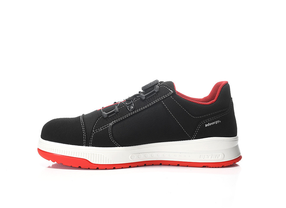 Sicherheitshalbschuh, ISAAK XXST BOA® black-red Low ESD S2, 720045-43, ELTEN WELLMAXX, Obermaterial: Hydrophobiertes Textilmaterial/Hydrophobierte Mikrofaser, Atmungsaktives Textilfutter, Gepolsterte Lasche, Ganzflächige Einlegesohle SPORTIVE ESD black mit Anteilen aus recycelten Materialien, ESD-fähige Softvlies-Brandsohle, TPU/PU Sohle WELLMAXX STREET, Stahlkappe, EN ISO 20345:2022 S2 FO/SR, Form A