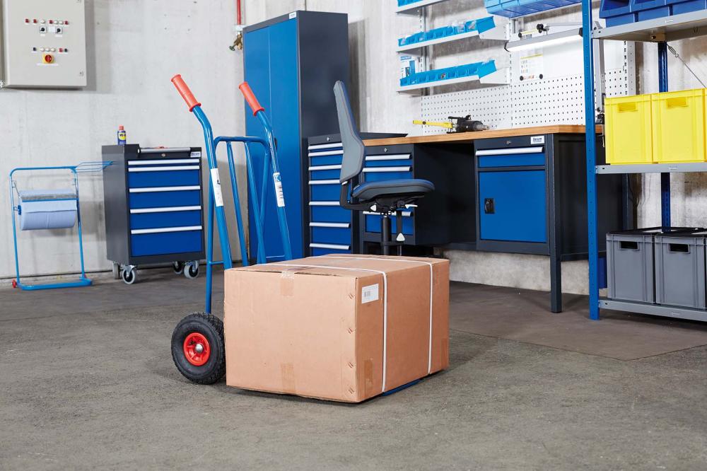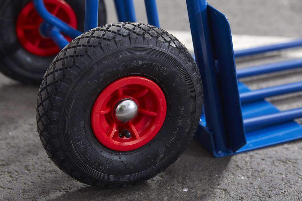 Die stabile Stahlrohr-Stapelkarre ist mit einer klappbaren und einer festen Schaufel ausgestattet.