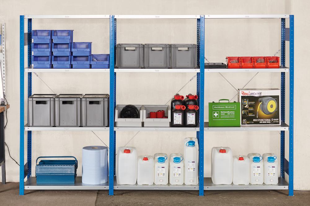 Hinweis: Regale mit dem Höhen-/Tiefenverhältnis >= 4 : 1 gegen Kippen sichern (Wand- oder Fußverankerung).