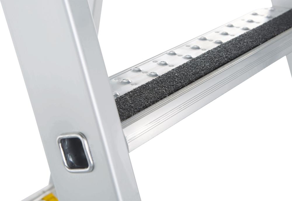 Die einseitig begehbare Stufenleiter verfügt über rutschsichere Stufen für den Einsatz in öligen oder nassen Bereichen.