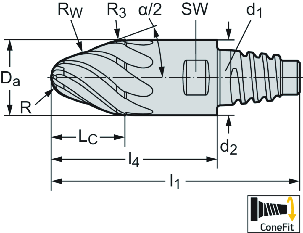 VHM-Kreissegmentfräser MD838 • ConeFit • WJ30RA • metrisch • Drallwinkel 30° • Dc=6mm • R=3mm • Z=8