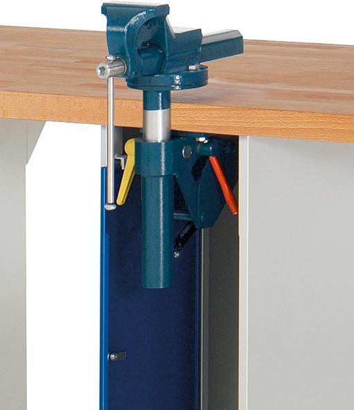 Die Werkbänke haben die Tiefe 900 mm. • Ausführung: 10 Schubladen 2x60, 2x90, 4x150, 2x270 mm, 1 x Schraubstockschrank mit Schraubstock 120 mm und Klapplift • Baukastensystem: Gestellfüße aus C-Profil (70x50x2 mm) mit 120 mm breiter Auflagefläche (oben) in Kombination mit Unterbau-Containern (BxT 580x650 mm) • Buche-Massiv-Arbeitsplatte: Stärke 40 mm, geölte Oberfläche • Schubladen: Größe L Innenmaß BxT 490x560 mm, Tragkraft 100 kg, Auszug ca. 90 % • Ergo-Script® Griffleisten: mit integrierten Beschriftungsstreifen • Zentralverschluss: Schloss mit 2 Schlüsseln • Flächenlast: max. 1000 kg • Umweltfreundliche Pulverbeschichtung: Gestelle/Gehäuse: RAL 7035 lichtgrau, Schubladen RAL 5010 enzianblau Lieferung: Erfolgt komplett montiert.