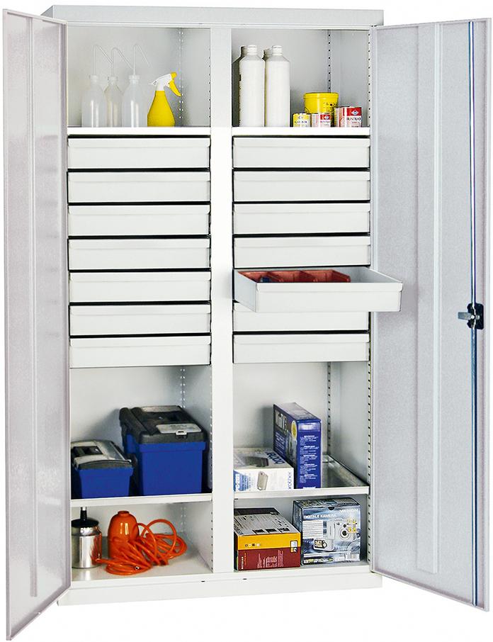 Werkzeug- und Materialschrank Serie 2000, 14 Schubladen, 4 Fachböden, Mitteltrennwand