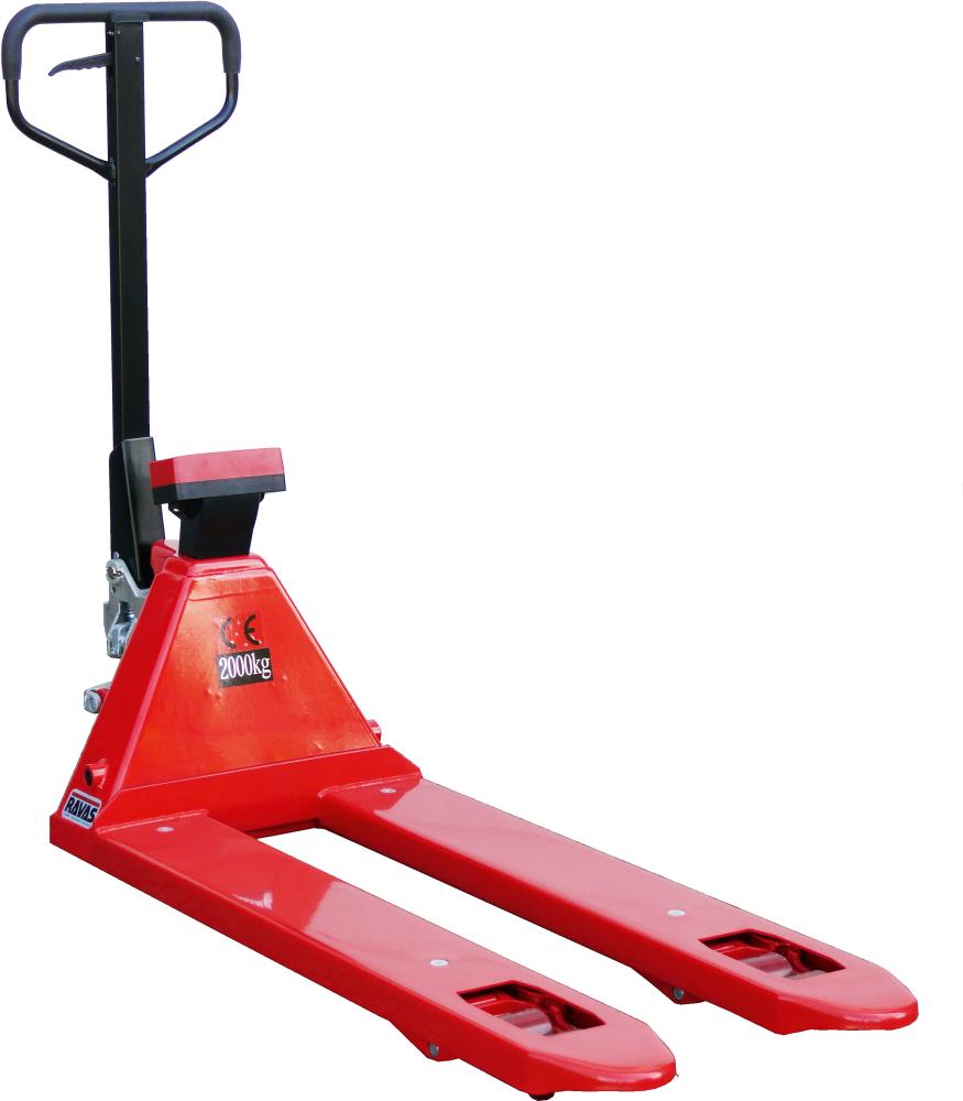 Der Gabelhubwagen hat einen Messbereich bis 2000 kg und eine Pumpe mit Schnellhub.